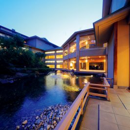 客室で一息ついたら、日本三大御湯の一つである名湯をいただきに浴場へ。広々とした露天風呂はここちよく、思わず長湯をしてしまいそうだ。離れはお部屋で、本館の客室に宿泊の場合は組子細工の戸で仕切った食事処「料亭羽衣」で食事を。季節を映した茶懐石で、旬の美味を堪能しよう。