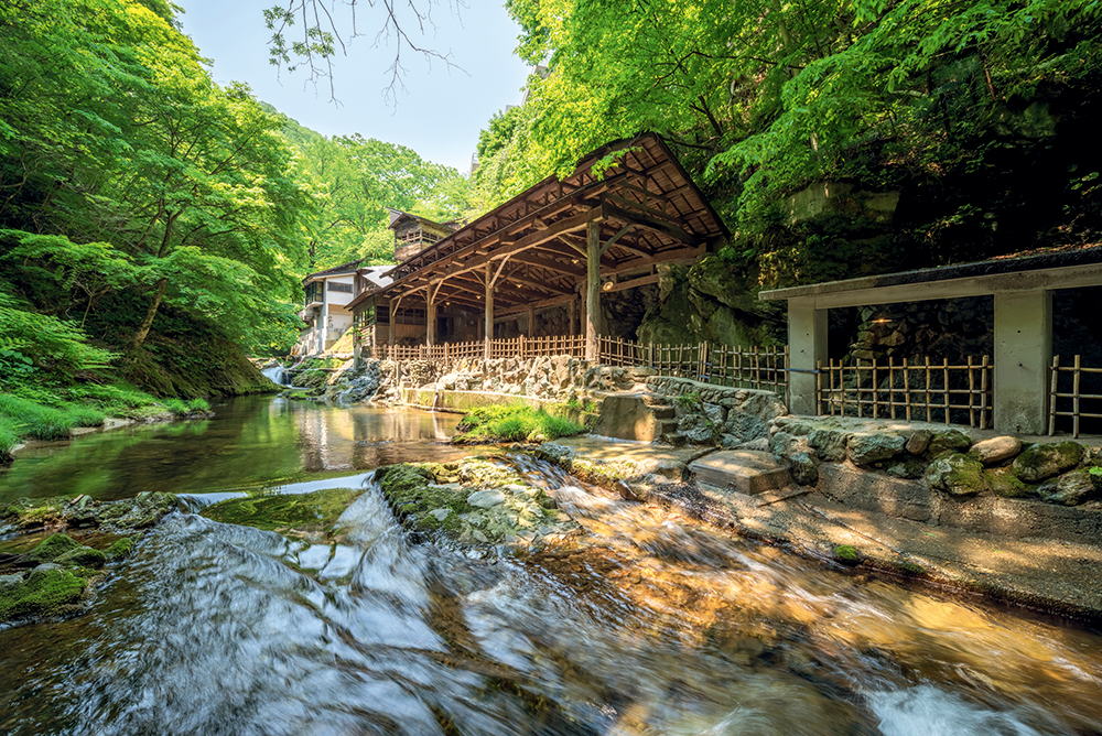 威風堂々とした門を抜け、宿のエントランスに足を進める。ここから始まるのは、創業200余年の風格を感じさせるもてなしだ。特に多くを魅了するのが湯量豊富な温泉。敷地内に5つの源泉が湧いており、すべての浴場が加水・加温をしない源泉かけ流し。さらに、4つある岩風呂は全国的にも珍しい自噴泉で、足元から湧く源泉が空気に触れることなく浴槽を満たす。