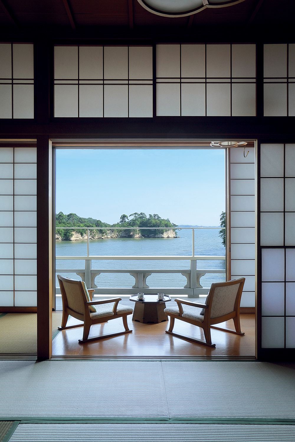 客室に通され、障子を開け放つと、穏やかな海が眼前に飛び込んでくる。部屋でいただく夕食は、宮城・松島の四季折々の旬を盛り込んだ会席料理。料理長の心遣いがこもった彩り豊かな品々が、目と舌を愉しませてくれる。食後はマリア・カラスやマレーネ・ディートリッヒが流れる「さろんくら」で、樽詰めの焼酎を一杯。部屋に戻ると、波穏やかな入り江に浮かぶ月明かりが出迎えてくれ、ほろ酔い心地で夢の世界へと誘われる。