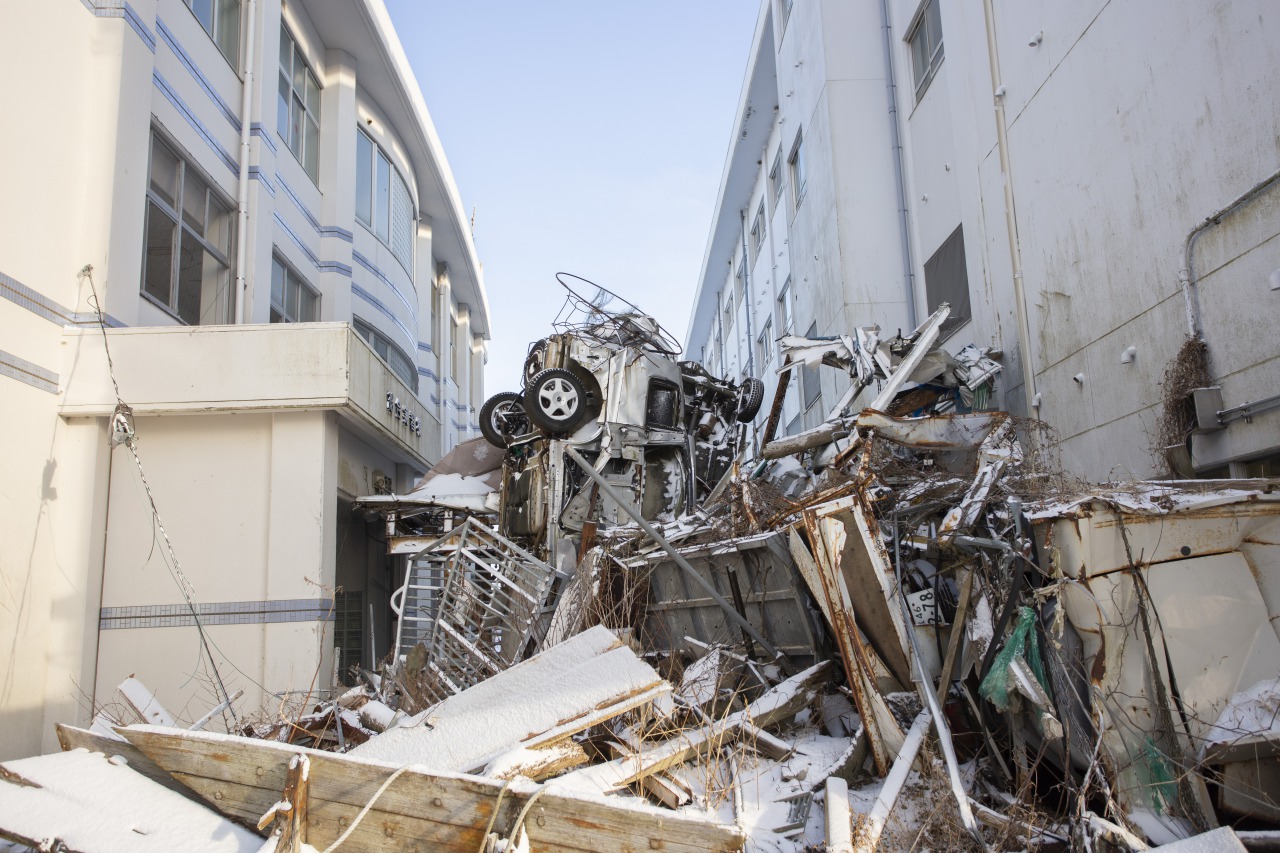 震災遺構である校舎に足を踏み入れると、教室には机や椅子、本、什器、コンクリートなどが散乱して足の踏み場もない。3階には流されてきた車がひっくり返ったまま置かれていて、窓からの景色とのギャップに驚かされる。