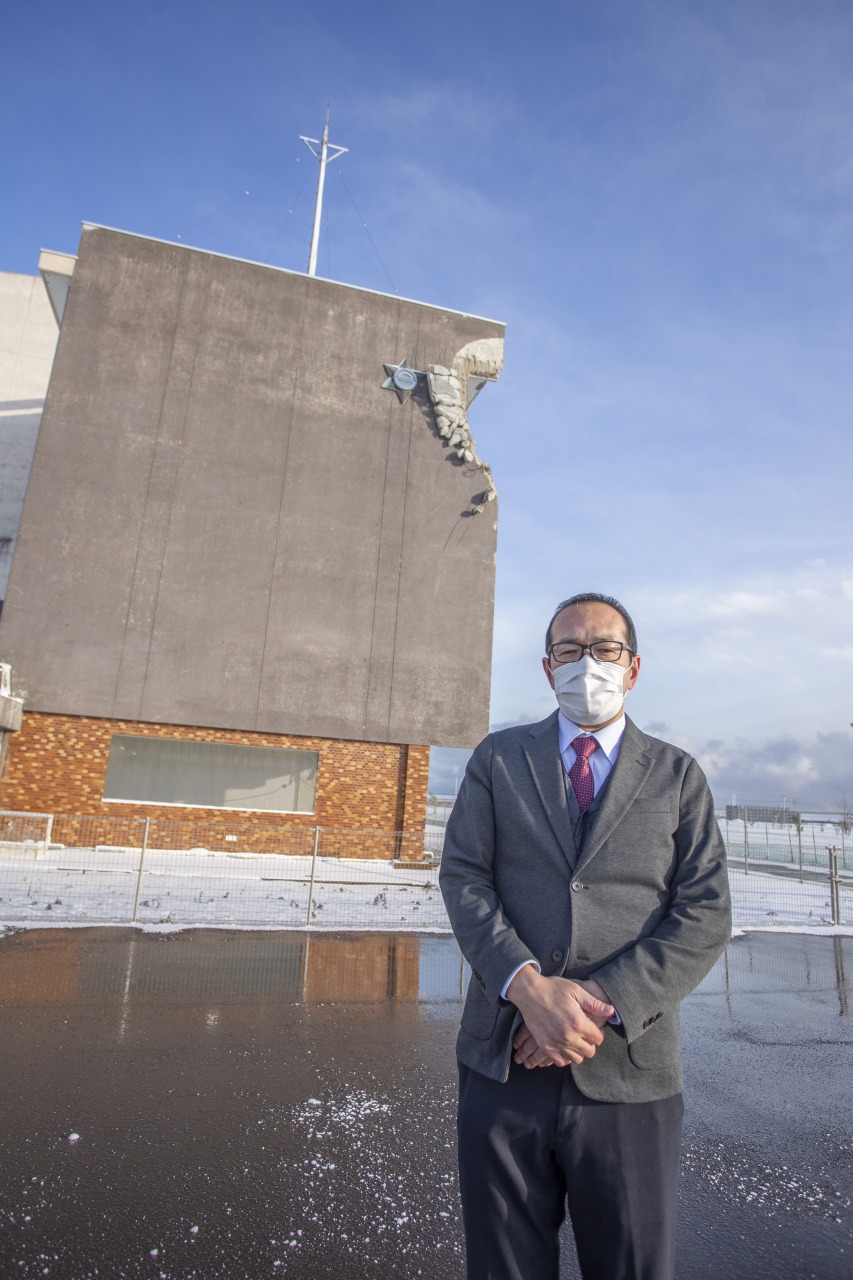 冷凍工場の衝突跡が残る校舎。信じがたい高さだ。「地震は14時46分でしたが、もしあれが15時30分だったら私自身生きていなかったかもしれません。市の職員として立ち会いに行く予定でした。私たちは生きているのではなく、生かされている。そんな感慨を持っています。すべてはタイミングだったのではないでしょうか」(佐藤館長)。