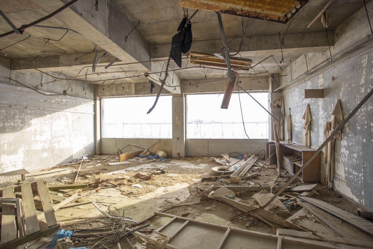 さらに高さ12mの4階には、冷凍工場の激突跡が残る。津波で流された冷凍工場は、正面衝突は免れたものの、4階ベランダに激突、折れ曲がった。室内に散らばるスポンジは壁材の一部。