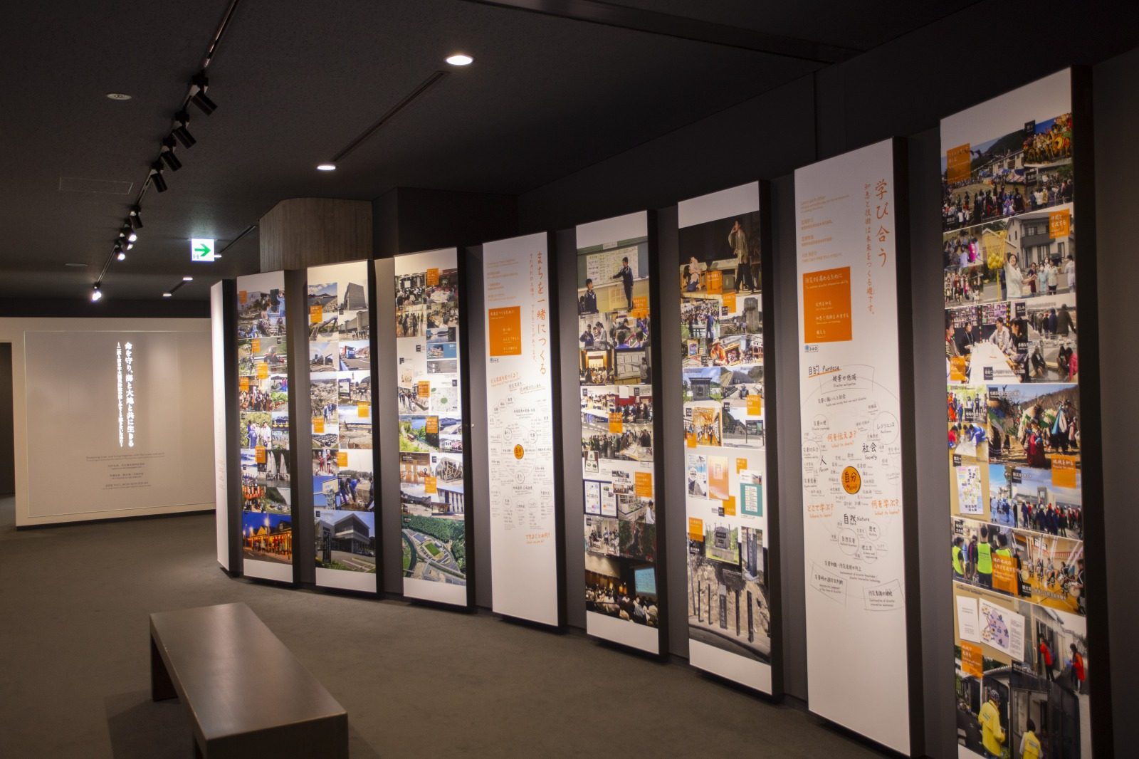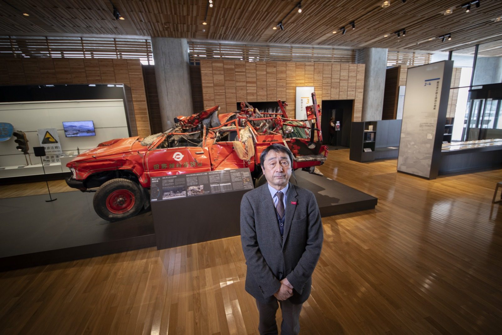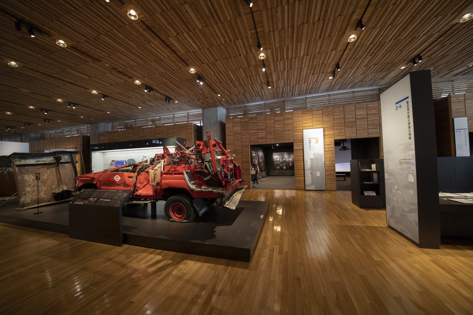 「歴史をひもとく」ゾーンには過去の津波が年表や地層の標本とともに示され、「事実を知る」ゾーンには、屋根のつぶれた消防車両、折れ曲がったバス停や駅の看板など、津波の脅威を感じさせる展示物が並ぶ。
