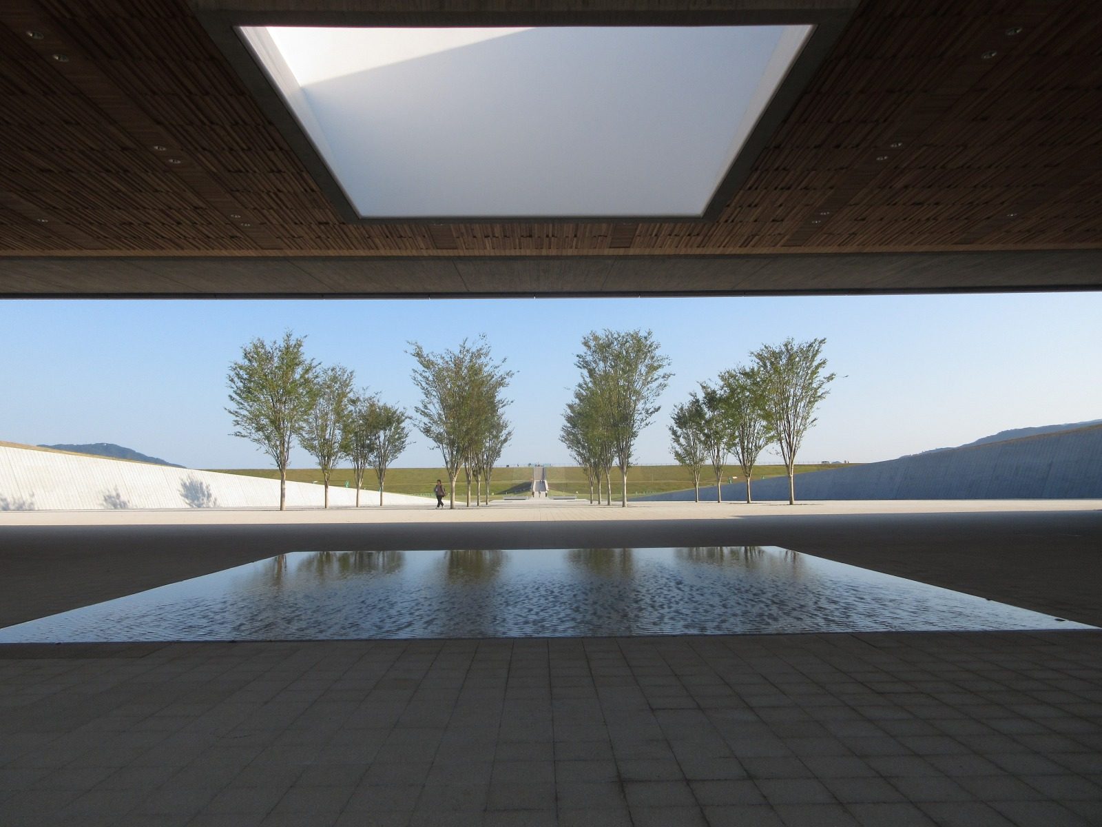 見学を終え、津波伝承館と道の駅をつなぐ「復興の軸」から「祈りの軸」へ。交差する中央部には水盤が設けられ、グリッド状に配植された16本のケヤキを水鏡のように映しこむ。樹々を抜けると献花台があり、花が手向けられている。周辺から遮蔽された静謐な場を創出するため、東西に築山を設けたという。