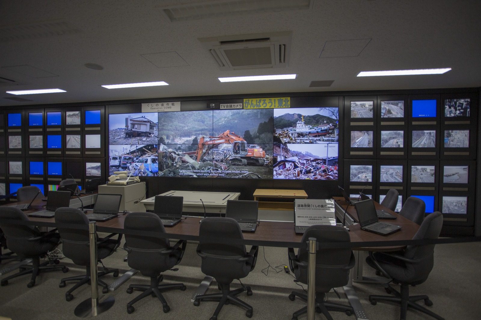 東北地方整備局仙台本局の災害対策室を再現。東北自動車道と国道4号線を縦軸に、太平洋に向かって横に延びる国道15ルートをくしの歯状に通す「くしの歯作戦」がこの部屋から指揮された。