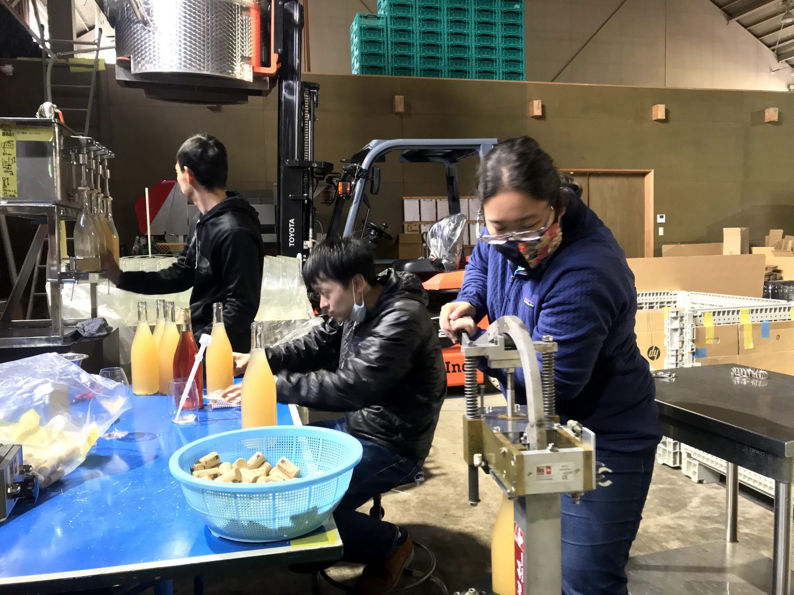 MORIUMIUSスタッフやボランティアによる瓶詰め、ラベル貼り作業。ラベルデザインとイラストは作家の向田智也さんが担当した。