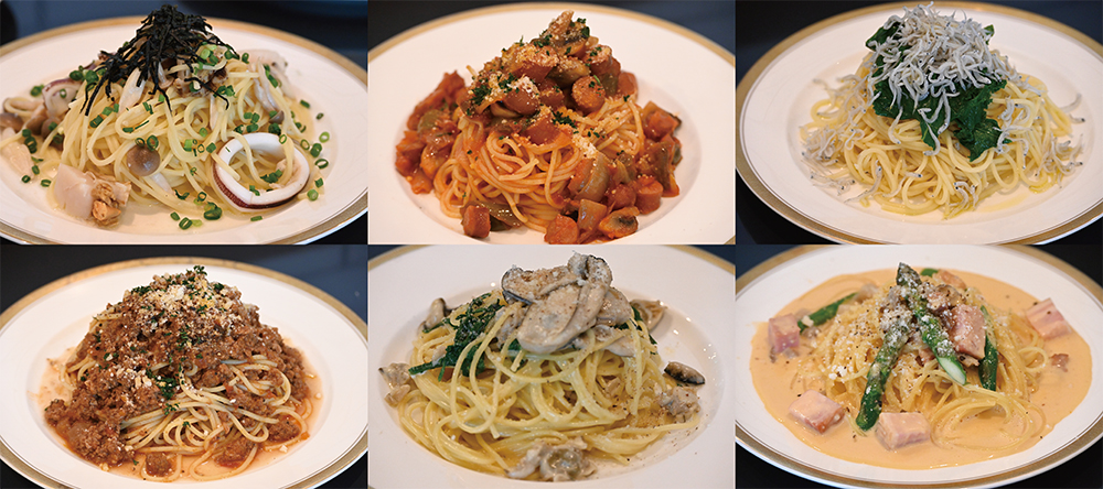 左上から時計回りに青森、岩手、福島、秋田、宮城、山形をイメージした「東北6県パスタ」(各1300円)。10時~15時のランチタイムにはサラダが付く。