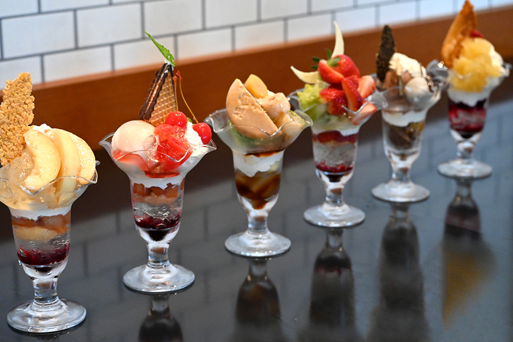 「東北6県パフェ」(各880円)。左から福島、山形、秋田、宮城、岩手、青森。