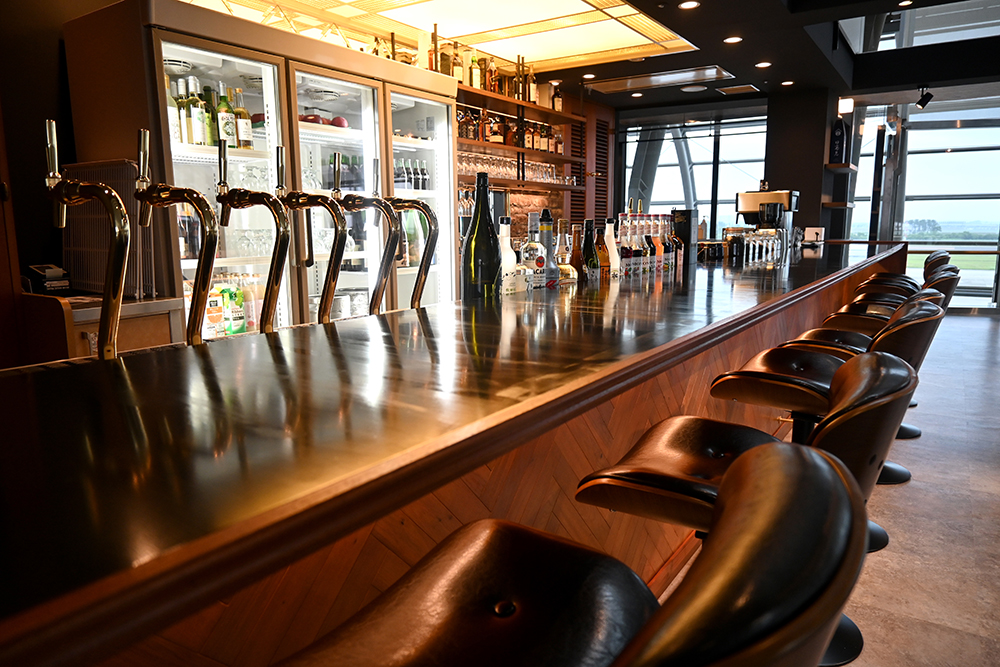 店舗入り口のバーカウンター。レンガ造りの重厚感ある柱や革製のカウンターチェアなどこだわりのインテリアや内装で落ち着いた大人の空間を演出。ビールサーバーを備え、空港内で唯一、樽生クラフトビールを提供する。