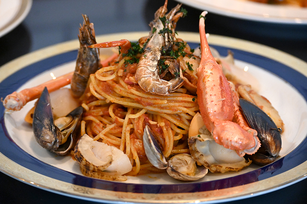 ホタテやカニ、エビなど東北の海の恵みを一度に味わえる「東北6県ペスカトーレ」(1800円)。豪快に盛り付けられた、見た目にも満足な一皿。