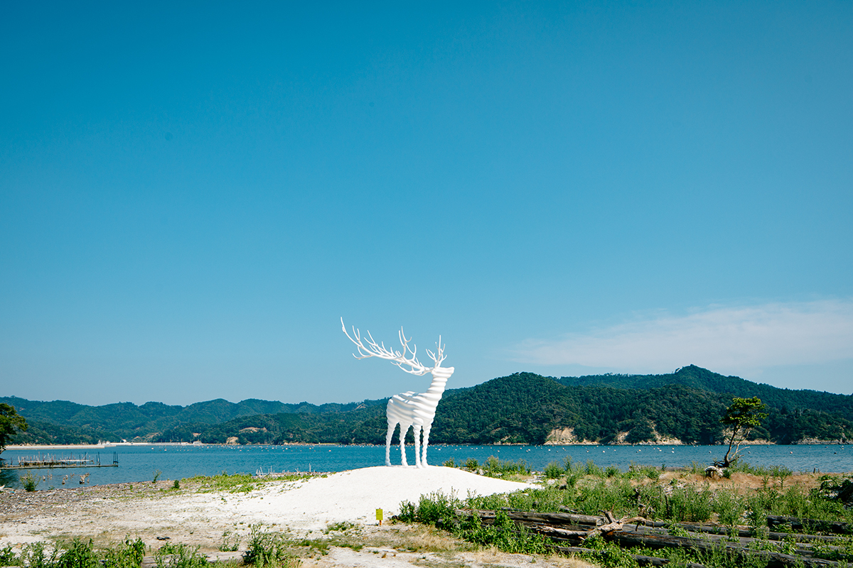 萩浜エリアにある名和晃平/White Deer(Oshika)© Reborn-Art Festival。第1回目に制作されてから、RAFの象徴とも言える作品となった。