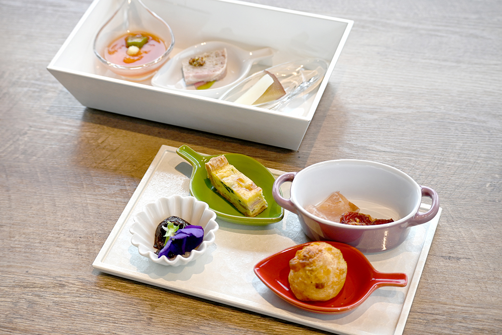 この日はワインのお供に、キッシュや生ハムなどを箱皿に詰めた「七ツ森前菜」(550円※ツアー代金とは別途)を注文。七ツ森にちなみ7つの品を盛り合わせた。