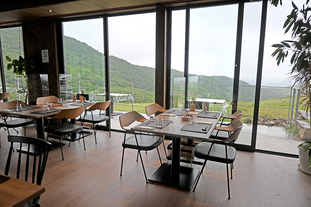 七ツ森の美しい山並みを眺められる店内。