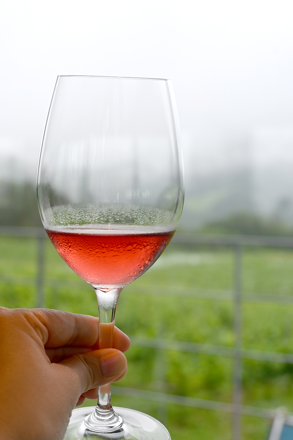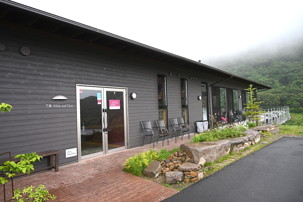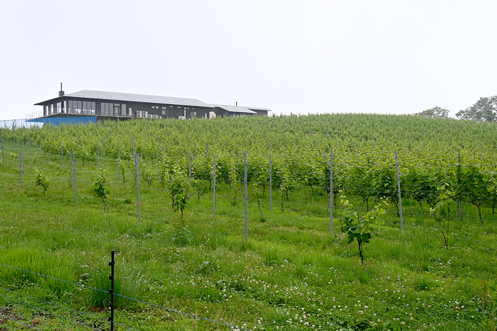 斜面いっぱいに広がるブドウ畑。丘の上に建つのが『了美ワイン&ダイン』。