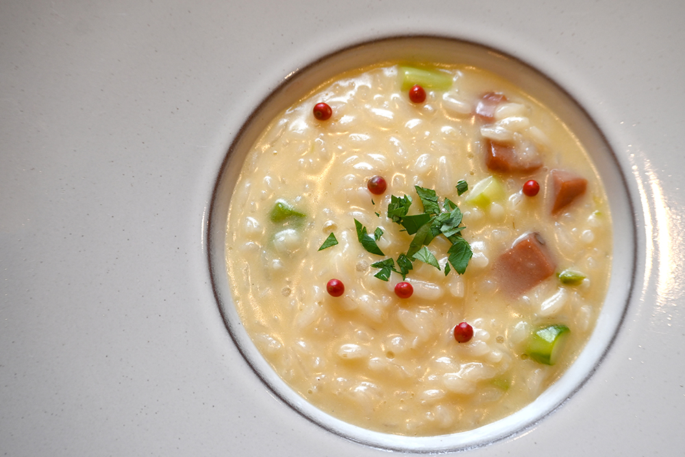 【リゾット】モルタデッラとアスパラガスのクリームリゾット。※パスタまたはリゾットは6種類から1つ選択(一部別途料金)。