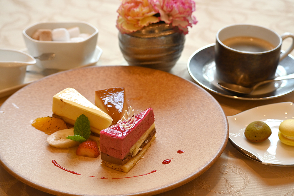 【ドルチェ】この日はカシスショコラムース、オレンジムースのケーキ、カラメルプリンをチョイス。コーヒーまたは紅茶、マカロンと焼き菓子のプチフールも付く。