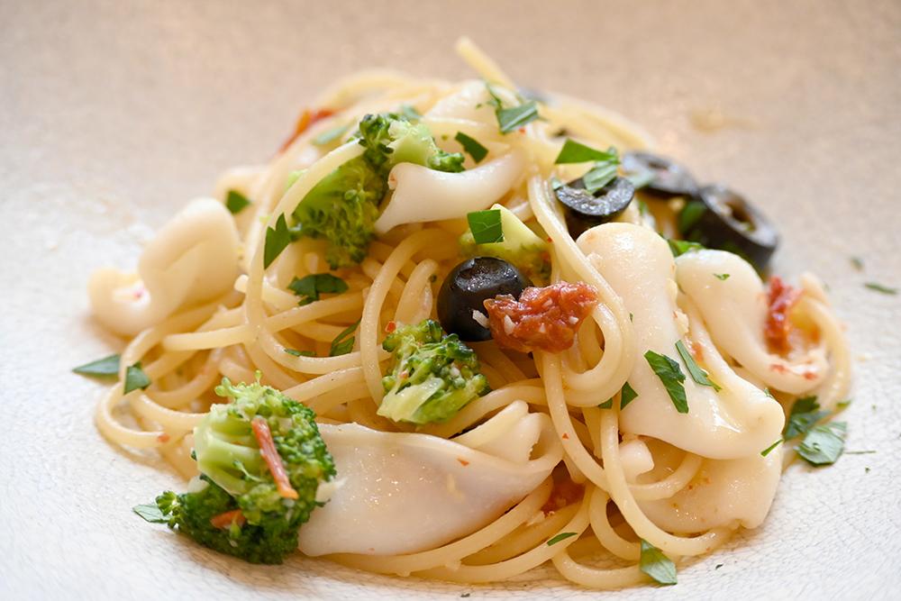 【パスタ】アオリイカ ドライトマトペペロンチーノ スパゲッティーニ。