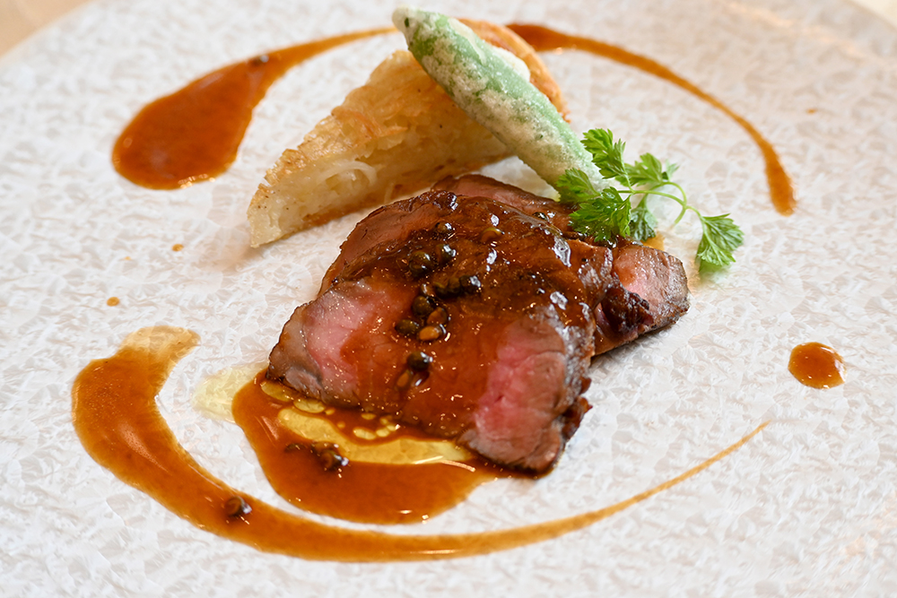 【メイン料理】牛サーロインのソテー グリーンペッパーソース。