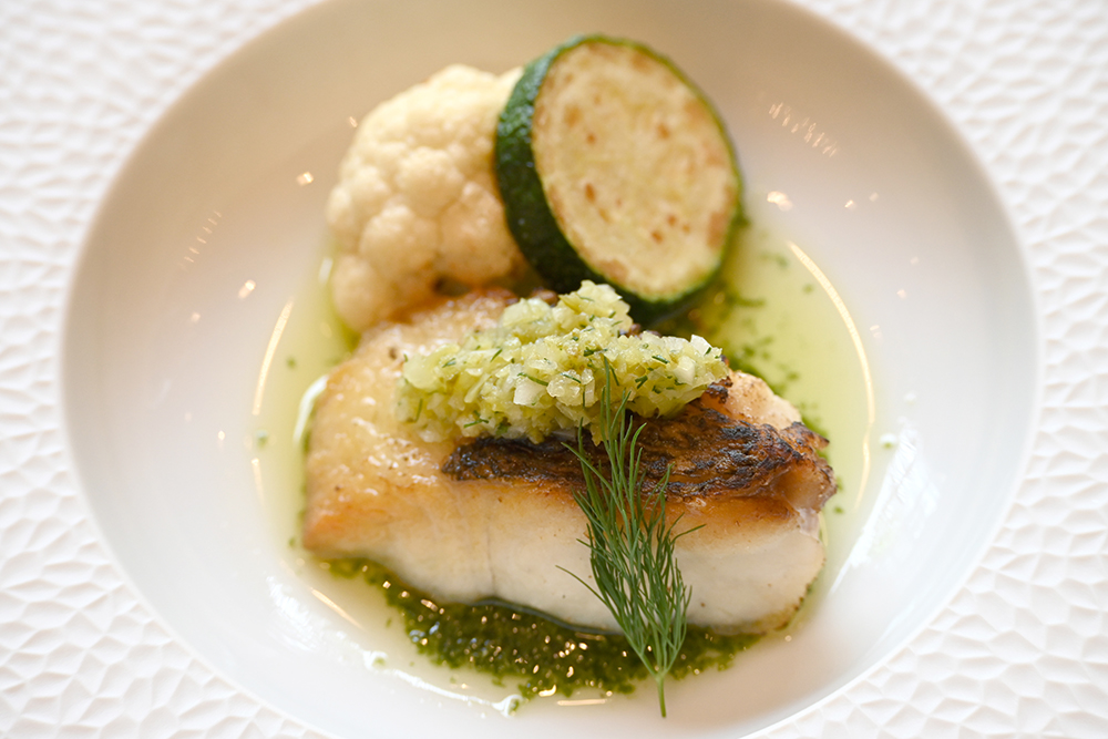 【メイン料理】鮮魚の炙り焼き ラヴィゴットソース。※メイン料理は肉または魚の4種類から1つ選択(一部別途料金)。