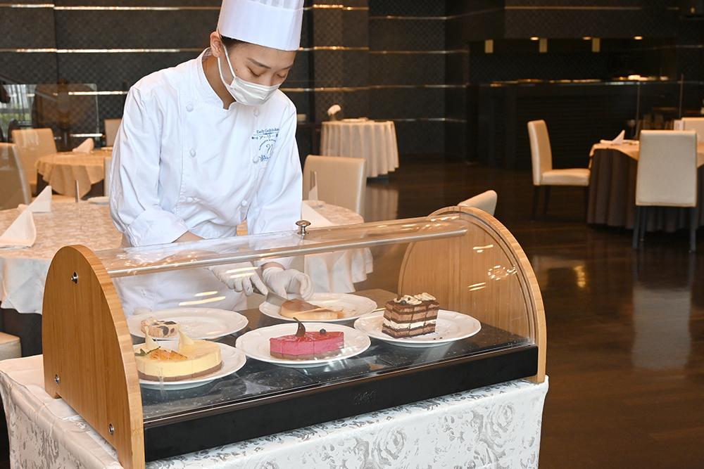食後のドルチェはワゴンサービスで。5種のケーキから3つが選べる。