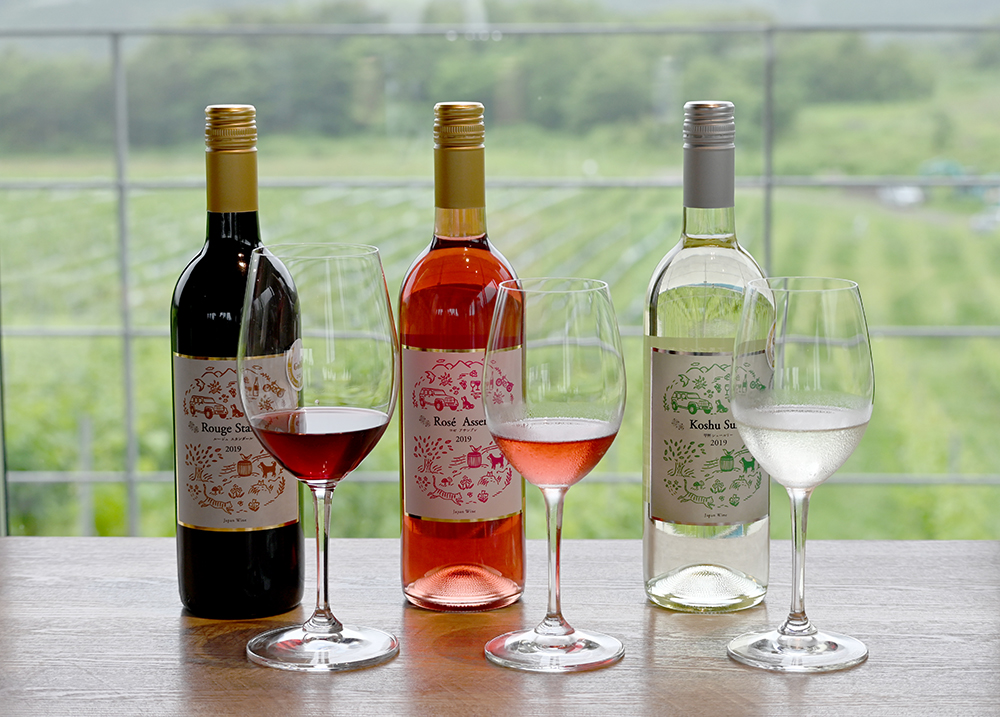 この日のワインは左から「ルージュ スタンダール2019」(赤)、「ロゼ アサンブレ2019」、「甲州シュール リー2019」(白)。