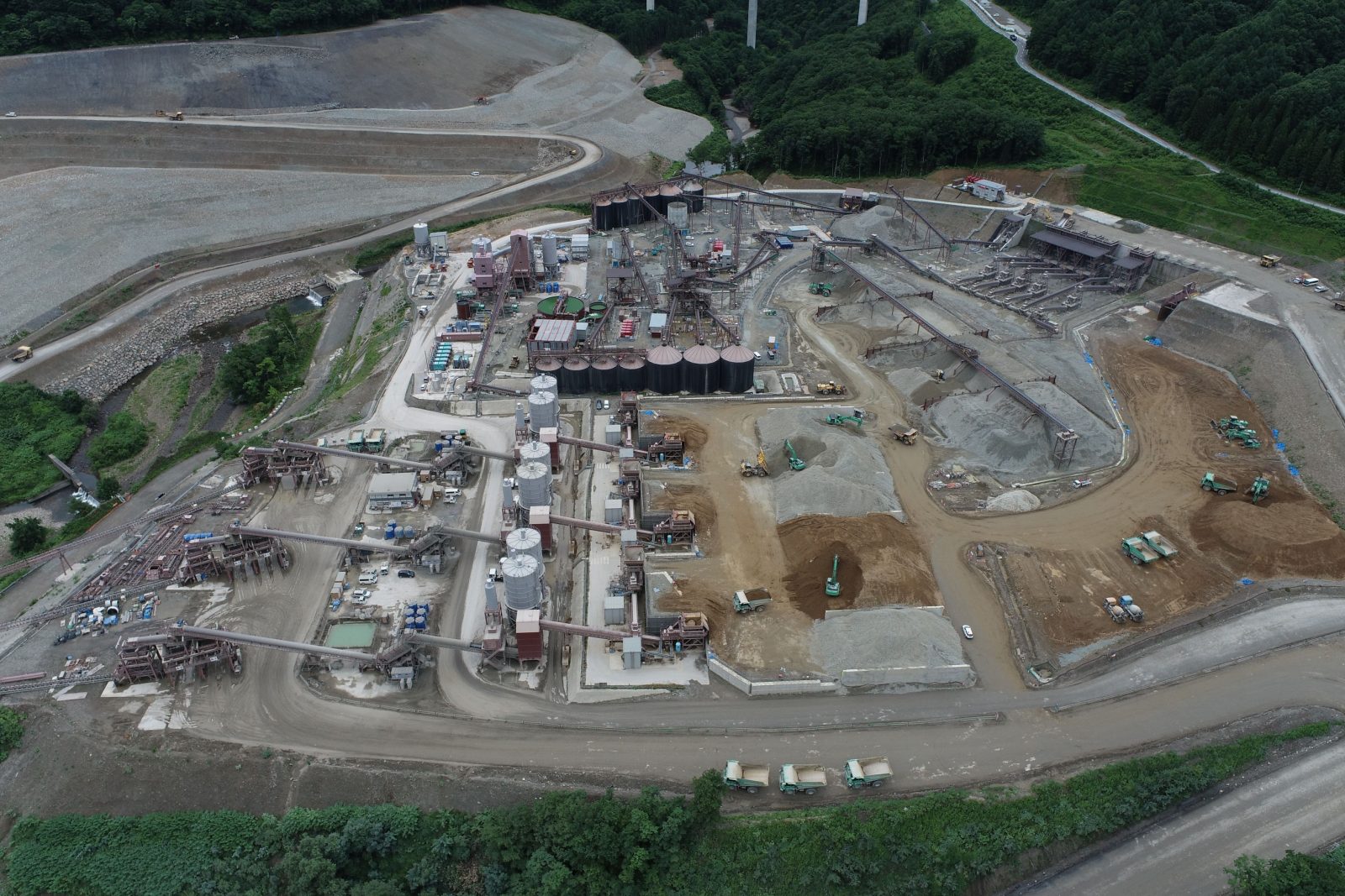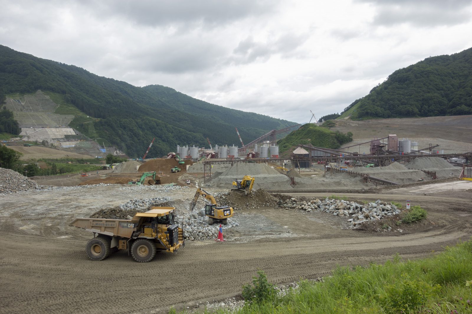 巨大な工事現場。手前中央の堤体工事のほか、左奥にプラント設備、右奥に原石採掘場なども見える。