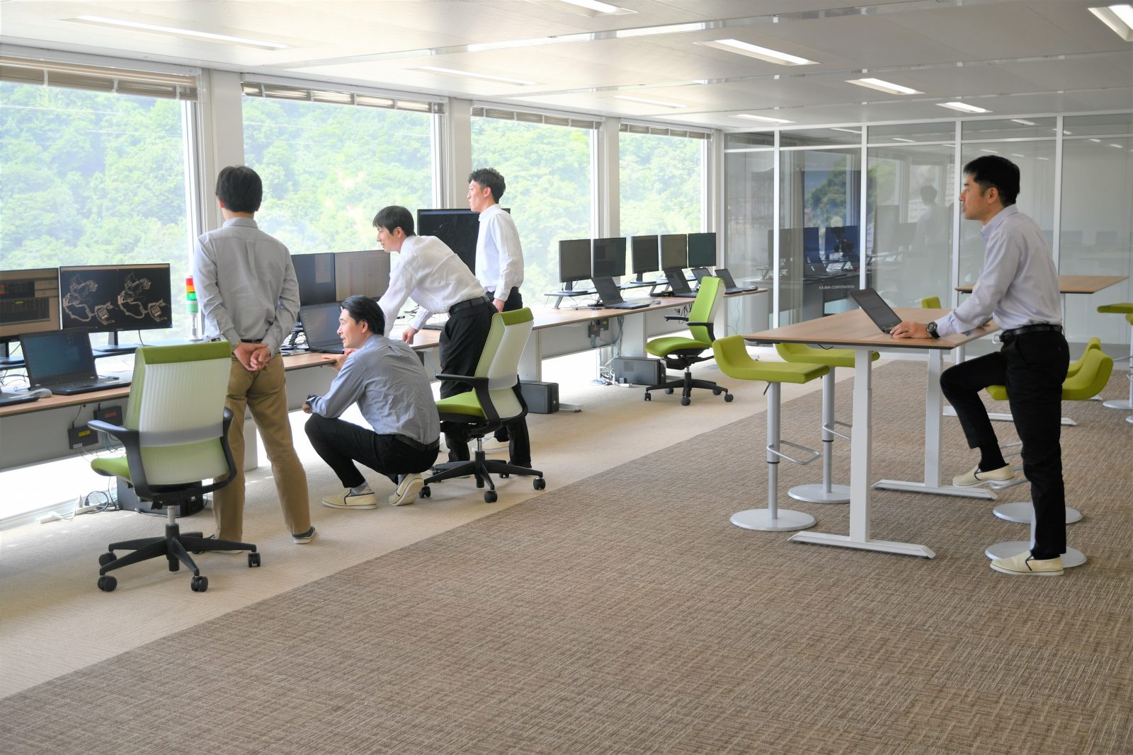 自動運転を行う建設機械の管制室。通常4名の体制で、ここから通信を使って重機にプログラムを送り、機械の動きを監視する。(c)2021 KAJIMA CORPORATION