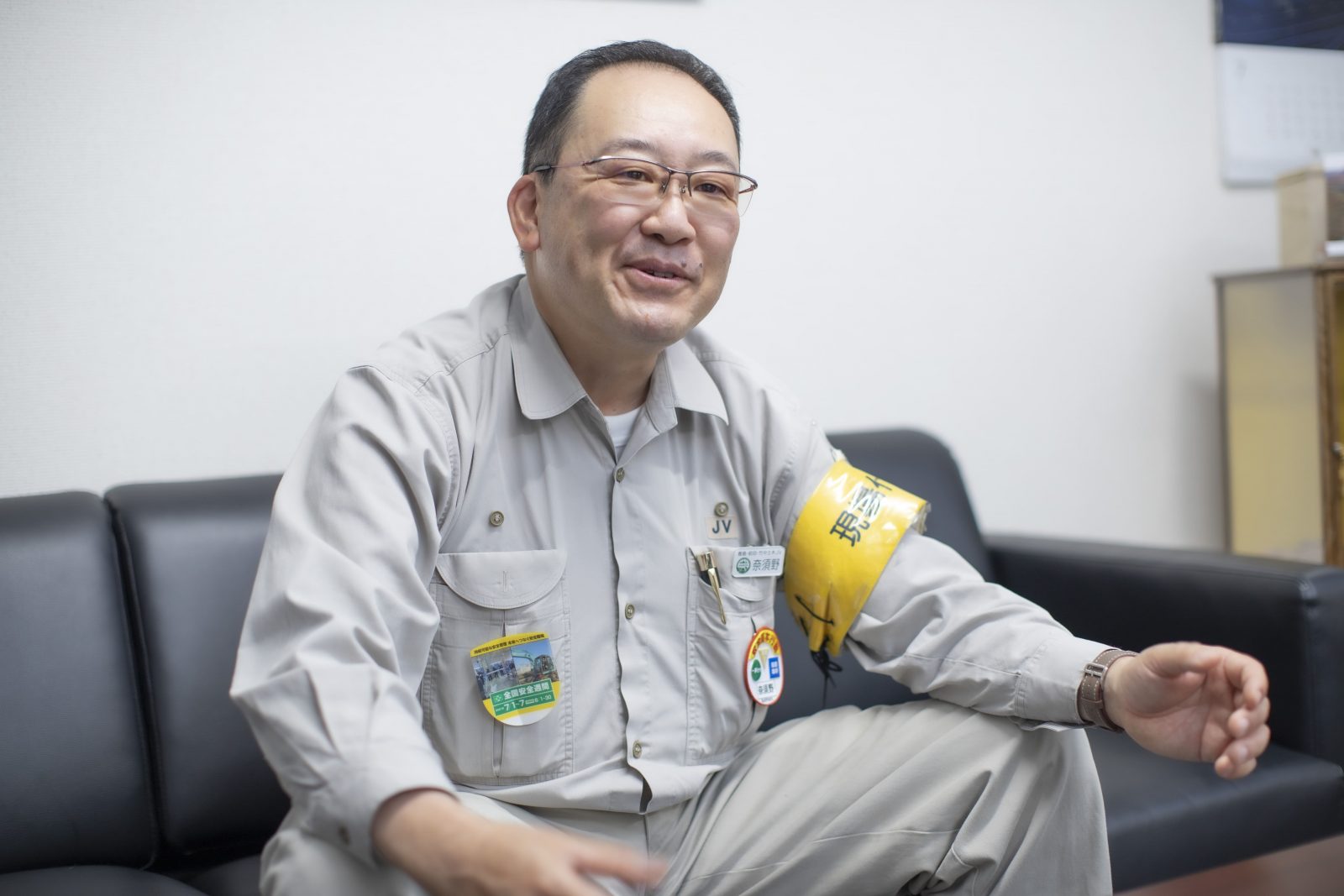 成瀬ダム堤体打設JV工事事務所所長の奈須野恭伸さん。鹿島建設でダム一筋のスペシャリスト。