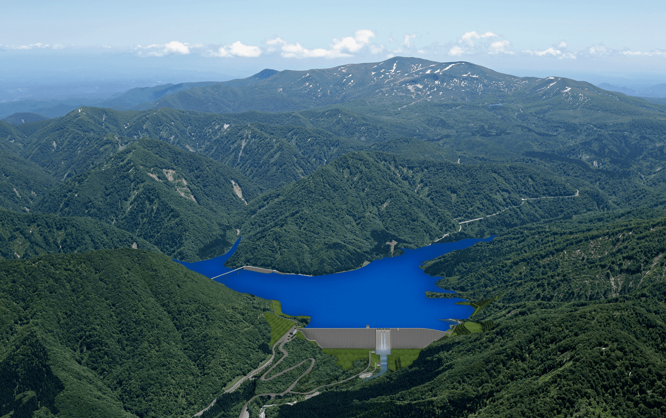 成瀬ダムの完成予想風景。奥に残雪の栗駒山が見える。自然豊かな栗駒山周辺は特に紅葉が美しいことでも知られている。