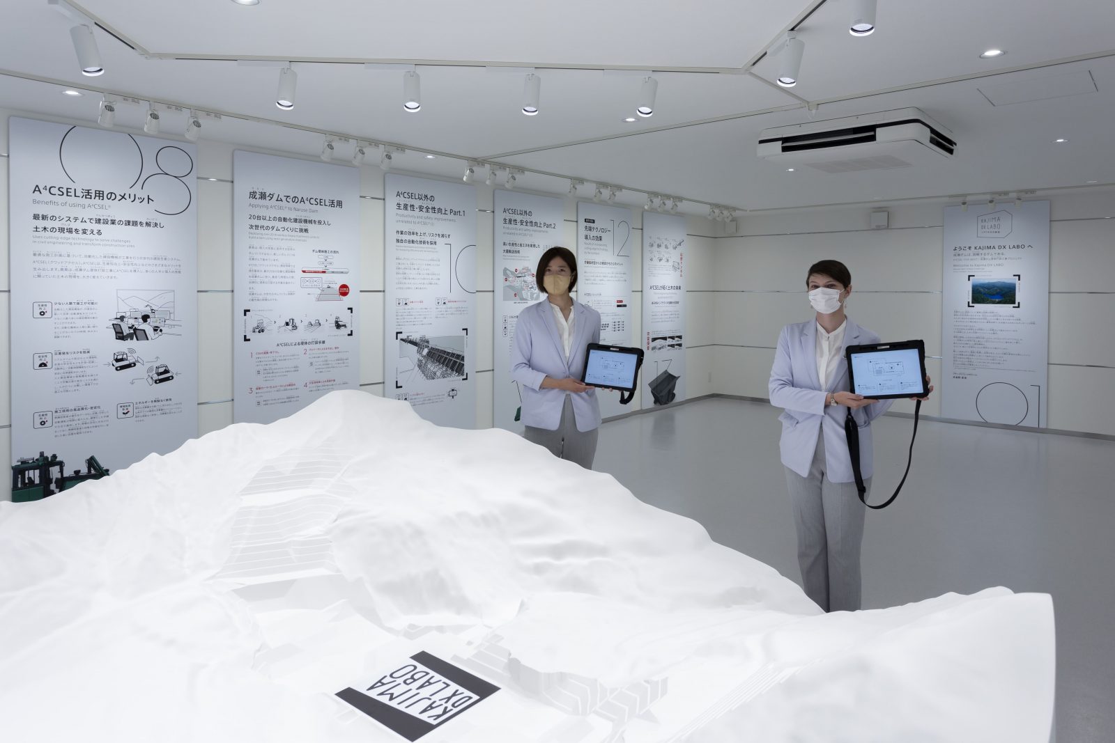まず、ダム堤体の建設現場脇にある「KAJIMA DX LABO」を訪ねた。ここは鹿島の最先端の施工技術や、成瀬ダム工事の概要について学べる施設である。シアタールームでの映像のほか、ジオラマやパネルが展示されており、そこに専用タブレットをかざすと、AR(拡張現実)技術によって完成後の画像などが連動して見られるようになっている。