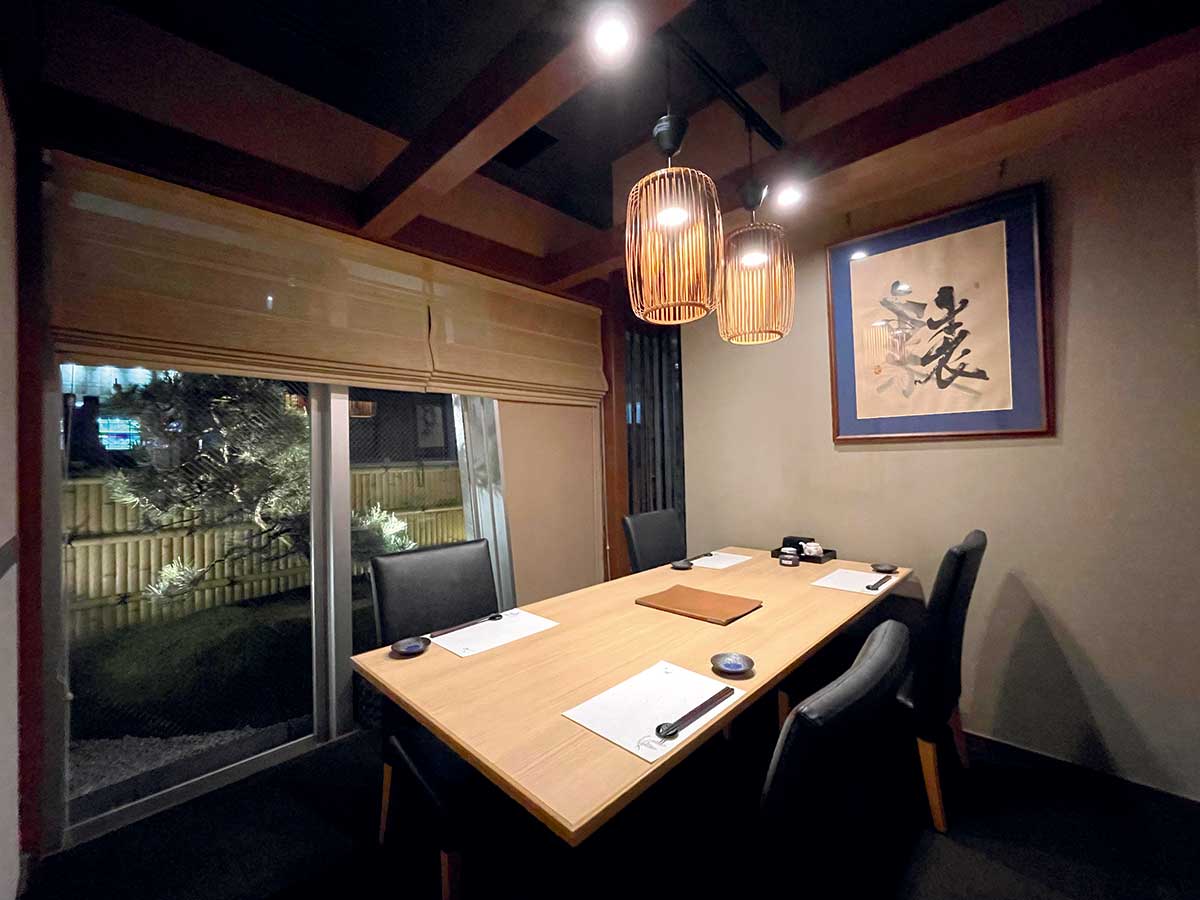 粋な坪庭が開放感あふれる雰囲気を演出する洋個室。「みやぎ飲食店コロナ対策認証店」なので、安心して会食を楽しめる。
