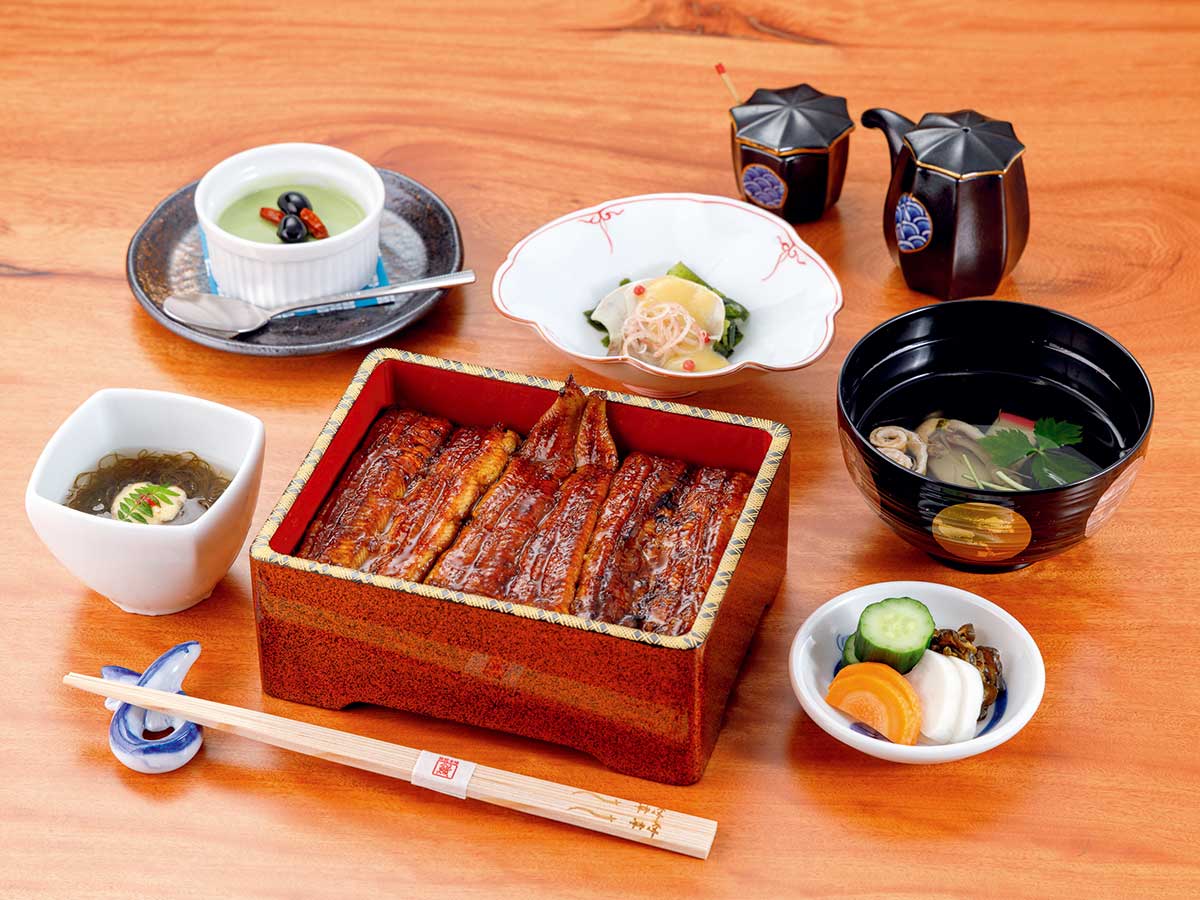 肝焼き入りうな重をはじめ、1万1000円相当の会席料理が贅沢に詰まった「二段会席膳」(9720円)。2日前の18時までの要予約。