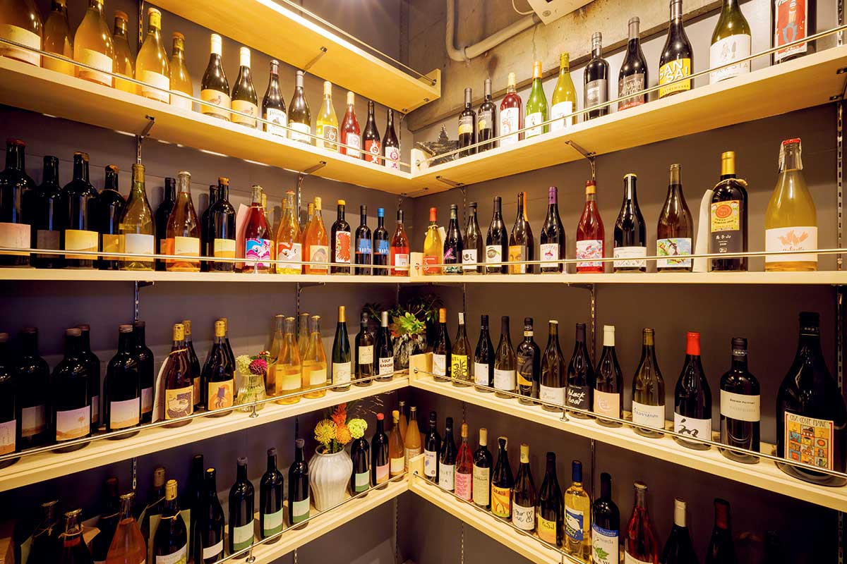 生産地の風土を感じるナチュールワインは、地場野菜と相性がいい。ウォークイン式のセラーには常時約100種を揃え、客も一緒に選べる。