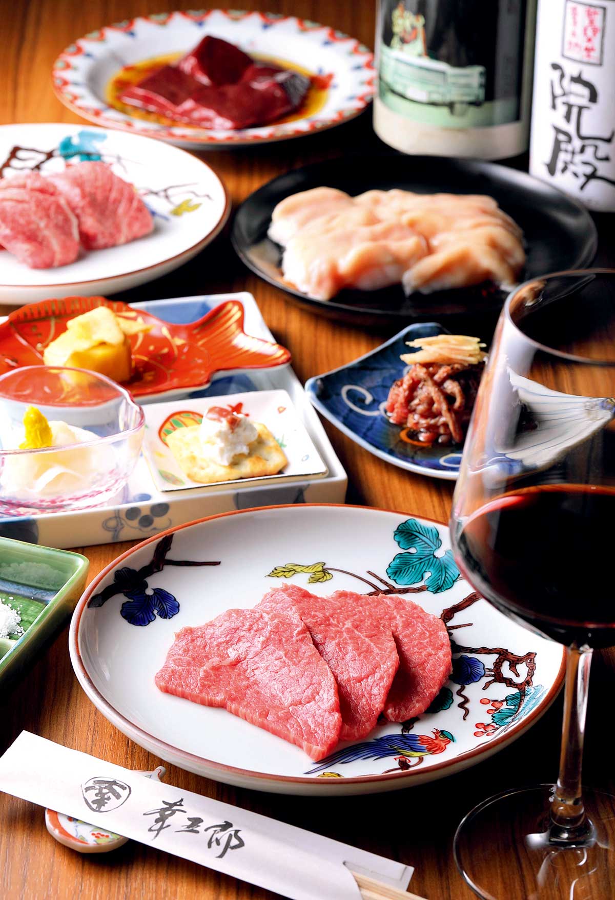 客席はすべて個室。大切な人をもてなす場にもぴったり。漢方和牛の味わいを引き立てる日本酒やワイン、焼酎も常時70種類ほど用意。