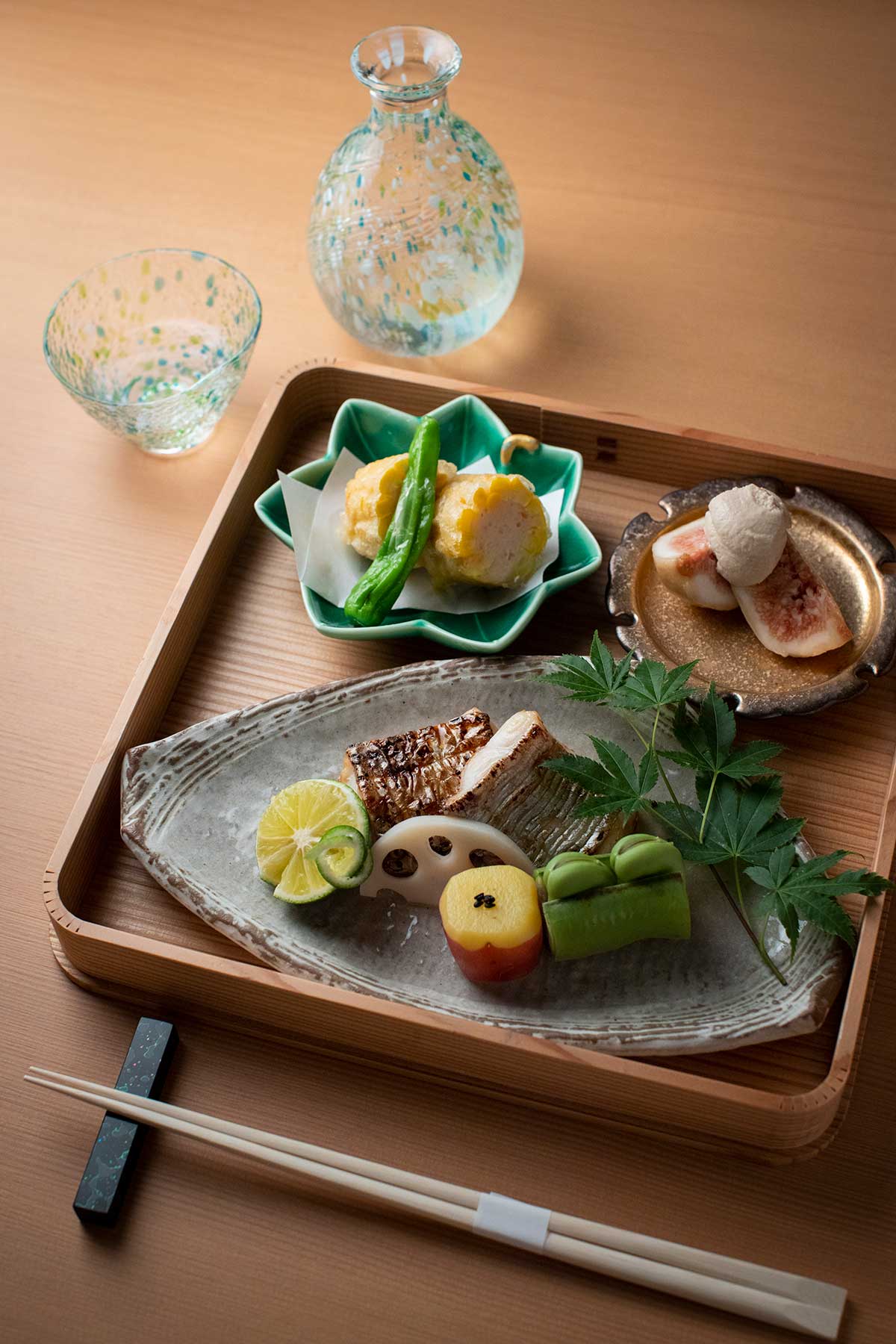 「焼き八寸」。芝海老のしんじょうを射込んで揚げたトウモロコシ、獅子唐、イチジクの胡麻クリームがけ、太刀魚の幽庵焼き、茹で蚕豆、新丸十のレモン煮、蓮根の甘酢漬。