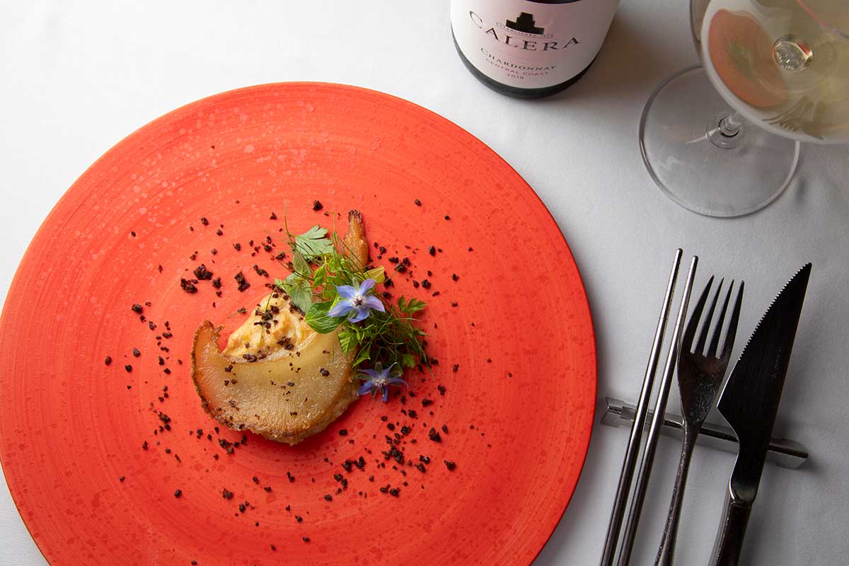 津軽鴨は、60℃を保ちつつ3時間かけてゆっくり火入れしたものを最後に備長炭で炙って仕上げる。パリッとしたクリスプ感と熱さの緊張を味わったのちに、じゅわっとあふれる鴨の旨み。肉の内側でジュが対流し、肉の繊維に回りきった福々しい旨みだ。