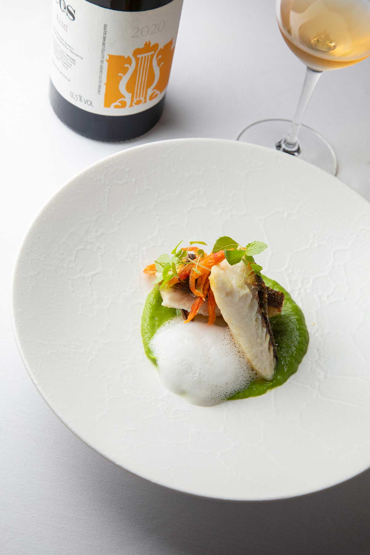鮮烈なオレンジが目を引く皿には、アブラツノザメの尾ビレのソテー。同じく八戸産の毛ガニを煮込んでソースに。ざくざくとした歯ざわりが心地よい。オオヒラメは皮目をバリッと焼き、にんにくの芽のソースとともに。エスプーマはなんと唐辛子で、合わせて食べるとアーリオ・オーリオになる仕立てだ。ウニの冷製パスタは、手打ちのタリオリーニと同量のキタムラサキウニを塩漬けし、水分を抜いて凝縮させた。どれも、食材の味がしっかりと伝わる料理だ。