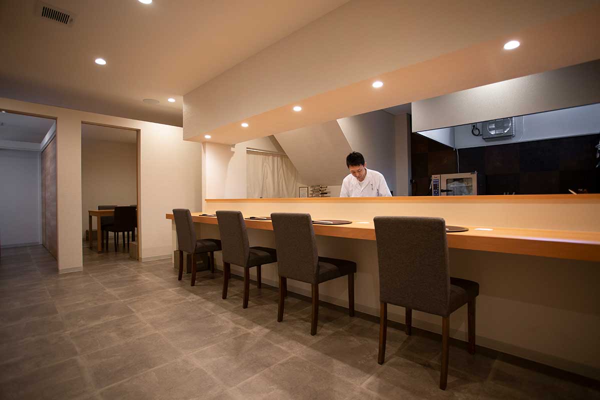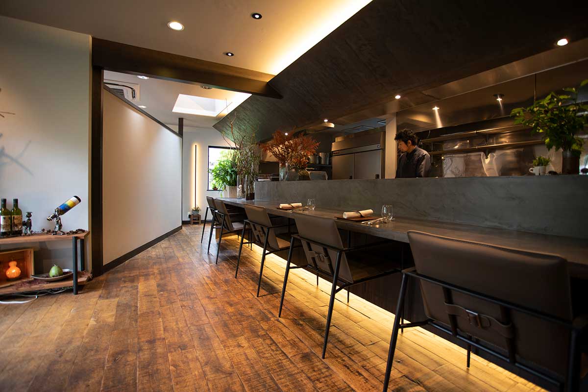 きっぱりと端正なカウンター。余計なものは何もない。必要十分な造作と厨房が、店主である三上統生さんのまっすぐな気質を表すかのようだ。