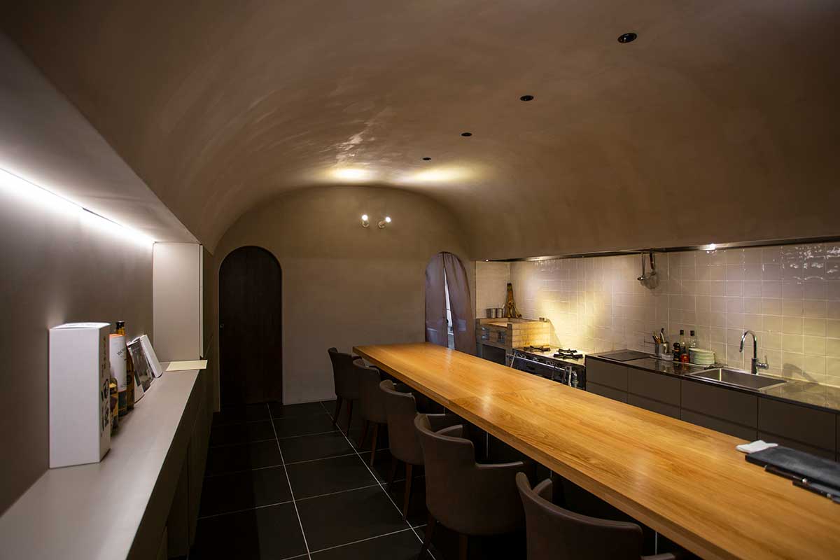 洞窟のような空間は、料理とそれを取り巻くファクターを集中して楽しむことができる舞台。