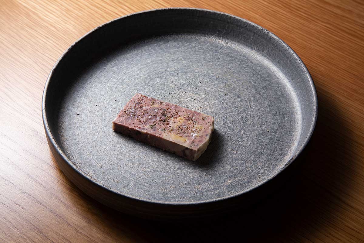 一見、何の変哲もないパテ・ド・カンパーニュ。しかしその素材は何とハクビシン。みっちりとした肉質のウデ、モモそしてレバーを使い、フォアグラとクルミ、パセリで軽やかな風味をプラスしてある。驚くほどにけもの臭さはなく、むしろ後味にムスクとヴァニラを足したような芳香が微かに残る。