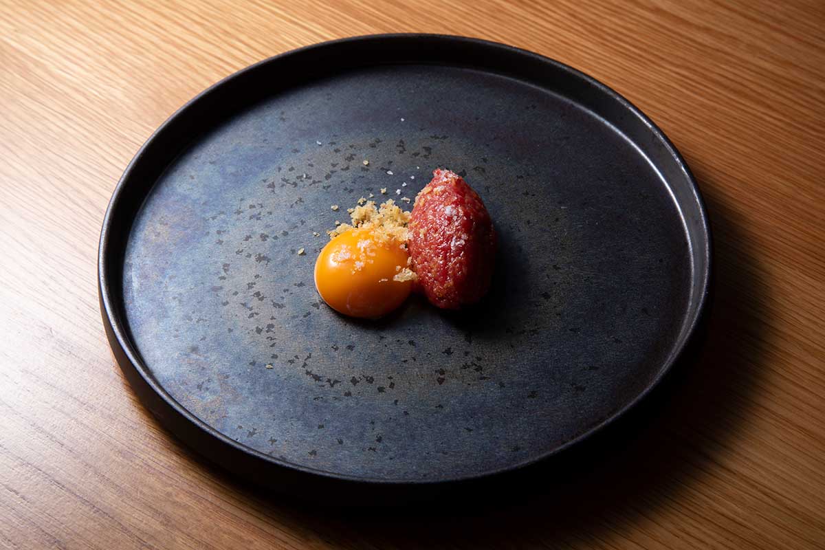 「馬のタルタル」。他の卵より旨みの濃い黄身が魅力の青森産アローカナ種卵。「けんちゃん卵」は『Kashu』のシグネチャーモデル。