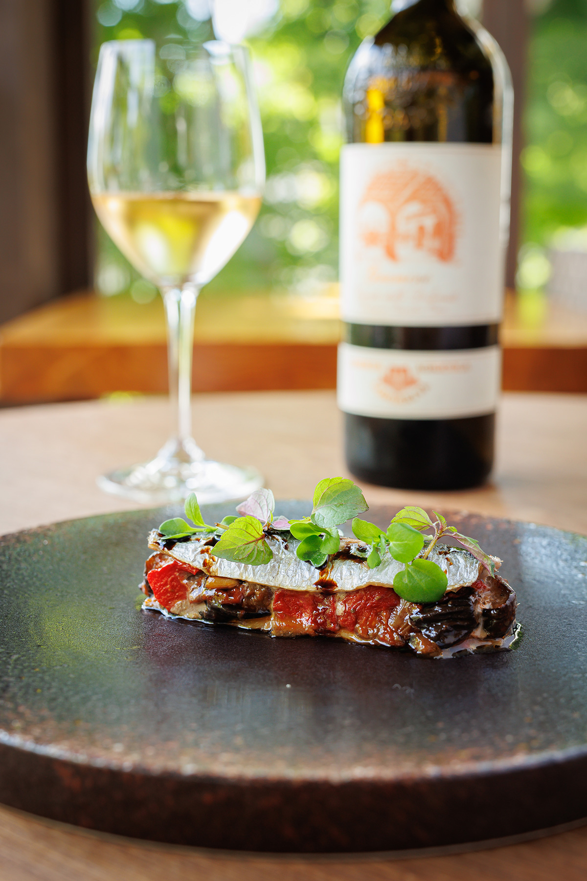 ディナーコースの前菜で供される「イワシとカポナータの冷製」。自然派ワインのピノ・グリージョを合わせて。