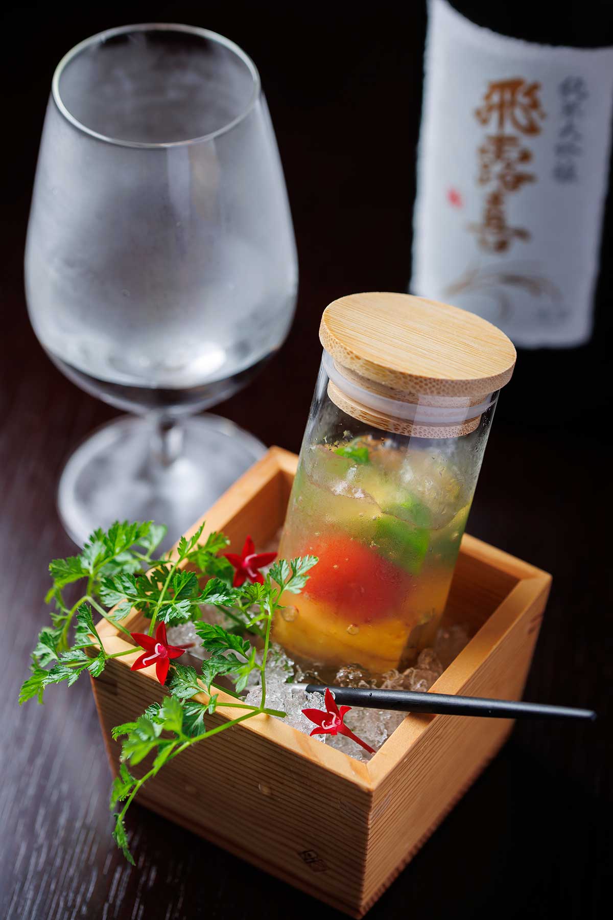 旨いもの、旨い味を知り尽くした上で供されるコースは実に多彩。その始まりは野菜が主役の一品と決まっている。「まずは体が喜ぶ料理を」と渡邉さん。夏の間は見た目も涼しげな「野菜のジュレ」。女将が合わせた地酒との相性もよく、あっという間に食べ終える。聞けば10種の野菜はそれぞれ酢漬けや赤ワイン漬けなどの下処理されたもの。ジュレには野菜を5〜6時間煮て取ったダシを使い、その野菜も3週間乾燥させたものだという。