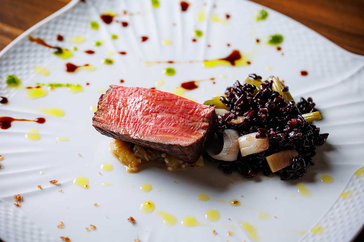 短黒牛は表面をバチッと焼き、あとは低温で火を入れる。猪苗代産黒米のリゾットと葉玉ネギを添え、肉の下には焼きナスのマリネ。 ソースは木樽に3年寝かせた自家製モストコット。