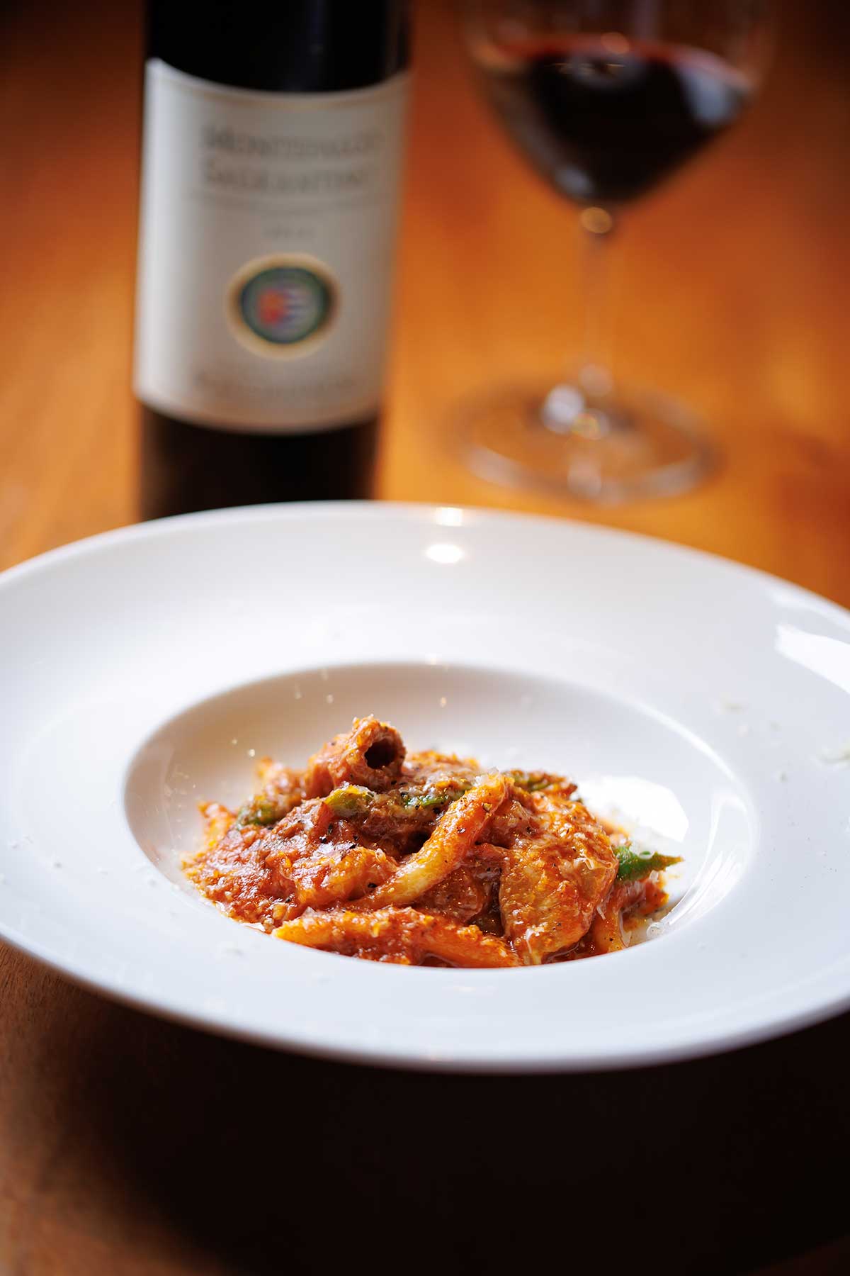 短黒牛のトリッパが手に入った時に出るトマトソースのパスタは 絶品。トリッパと手打ちパスタ・トロフィエの食感もいい。ウン ブリア州のモンテファルコ・サグランティーノと共に。