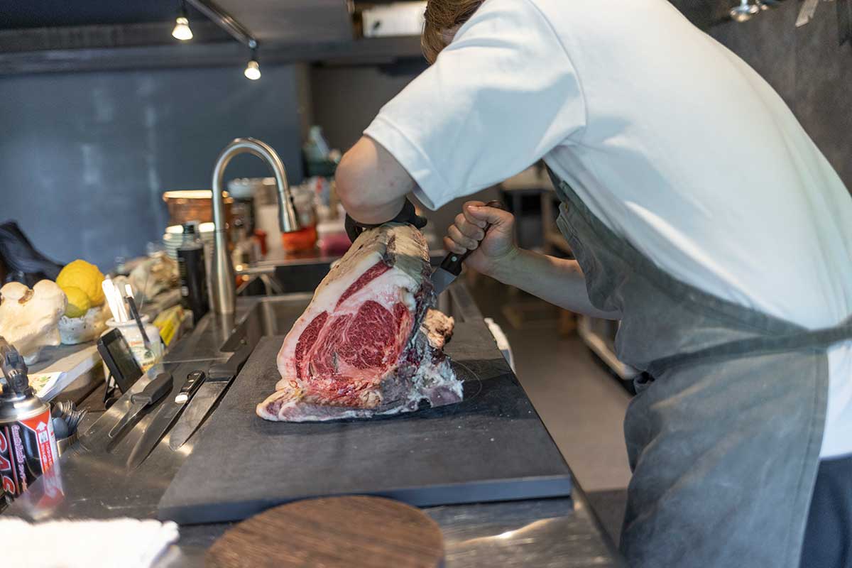 『Es』は、生産者と作り上げるひと皿がコンセプト。生産者の元を巡るうち、食材の持つ力に気づいたという。野菜一つとっても、土地によって、農園によって味が変わる。シェフの技術を真似することはできても、食材の持ち味を活かして料理をするには、食材そのものを理解しないと難しい。「生産地が近くなったので、日々勉強です。都内にいたときは、限られたフレッシュな食材でなにができるかばかりを考えていましたから」。店の看板である熟成牛も、生産者抜きには語れない。「とある牧場主さんが『食べられるために生まれてきた牛たちに、その人生をまっとうさせてあげたい』と熱く語ってくれたんです。その想いに応えたい」。店舗に隣接する熟成庫は3~4℃に保たれ、新村さんが肉の個性を引き立てる具合を見極め、適切な処理を施している。