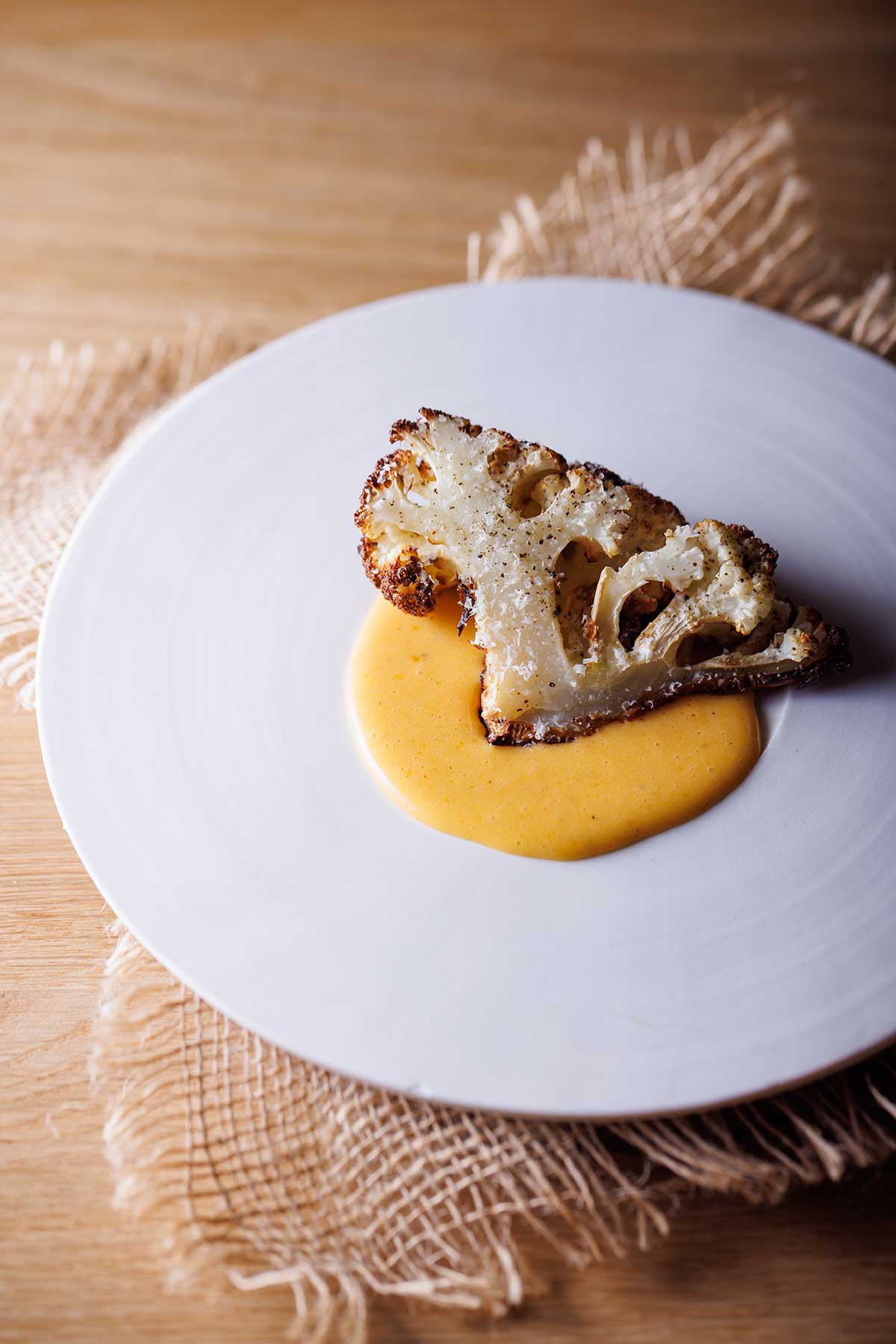 2時間かけて発酵バターをかけながら、じっくり焼き上げたカリフラワーのロースト。周りはカリッと、中はホクッとした食感が愉しめる。