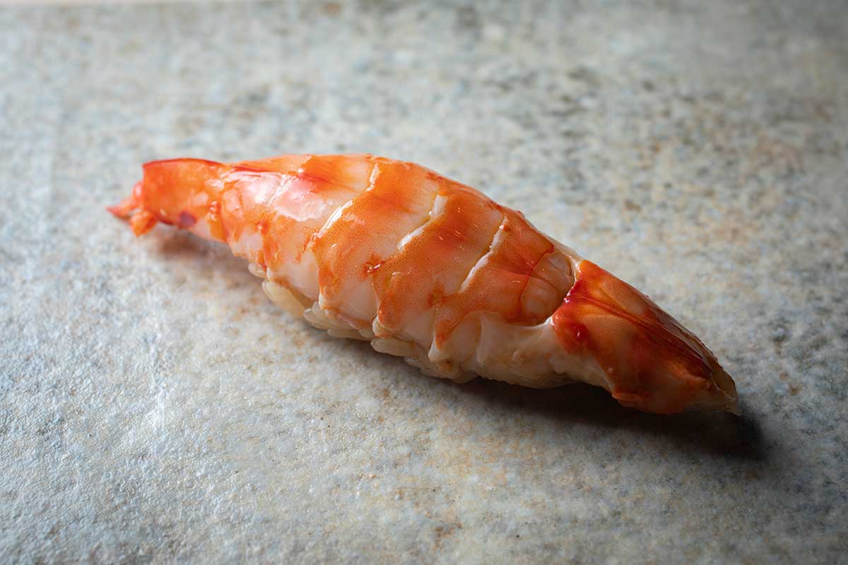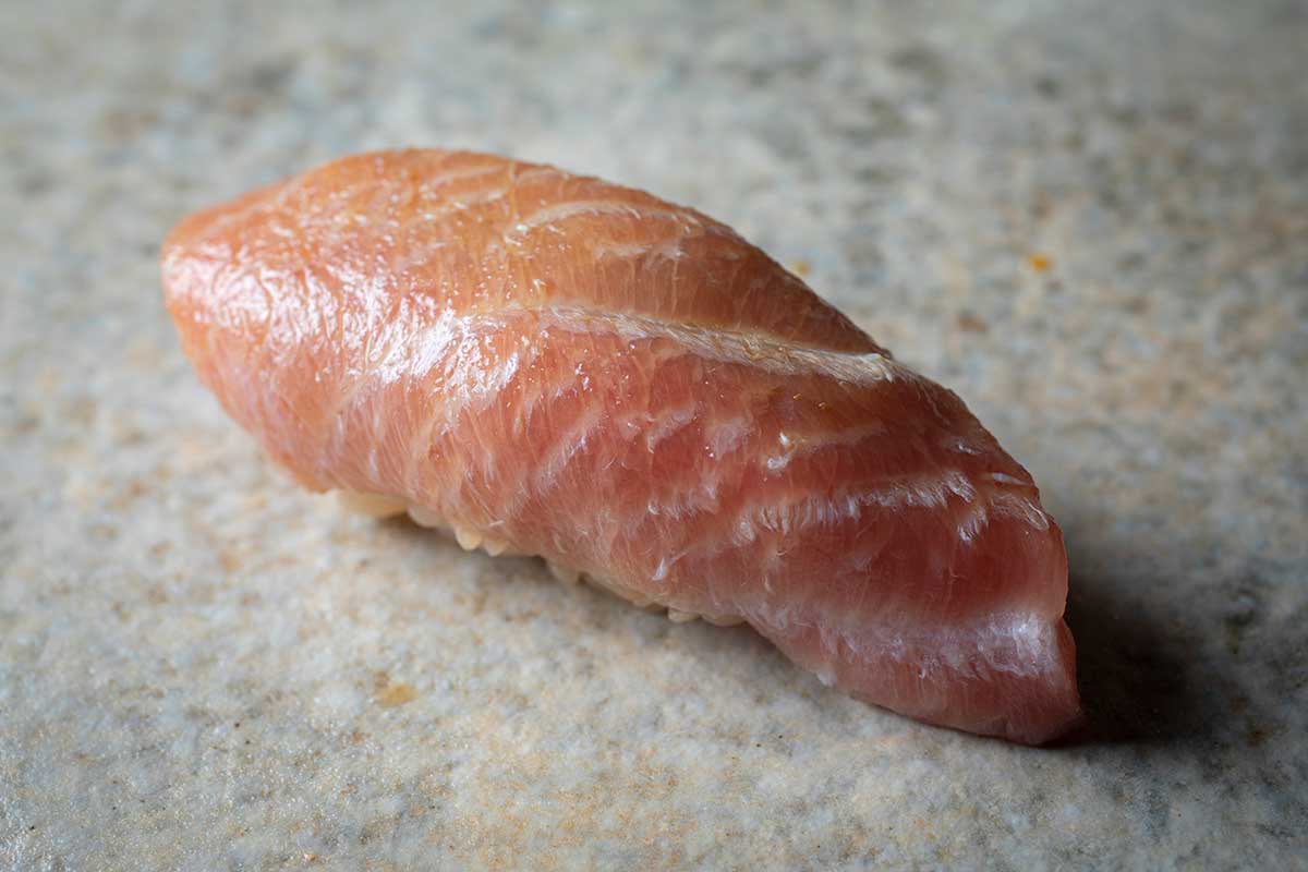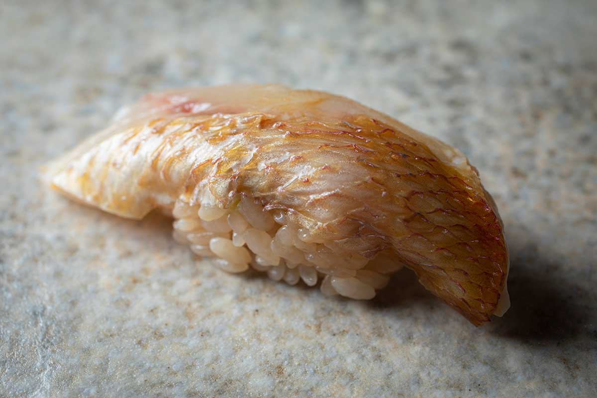酢〆のチダイは、軽くふんわりとした食感。握る前に軽く赤酢にくぐらせ、香りの一体感をより高めてある。ふわふわの身がはらはらとほどけるすし飯に絡まり、噛むほどにうまい。そう。岩沼さんの握りはすべて、噛むほどにうまい。種を上に口へ入れると、すし飯は舌の上でぱらりとほどける。すし飯には砂糖の甘さをほとんど感じないが、まろみ十分でカドがない。覆い被さる種の味わいを楽しみながら、硬めの飯粒を追いかけるように噛みしめてゆくと、あるものはとろけるように、あるものは染めてゆくように、またあるものはちりばめたようにすし飯との一体感を得てゆく。〆の手法や塩梅、塩や酢の種類なども、魚種やその日の魚の状態で変えるという。土台たるすし飯とそれぞれの魚本来の持ち味をどこで添わせ、どこにインパクトを持たせるか、おそろしく緻密な計算がなされているのだ。