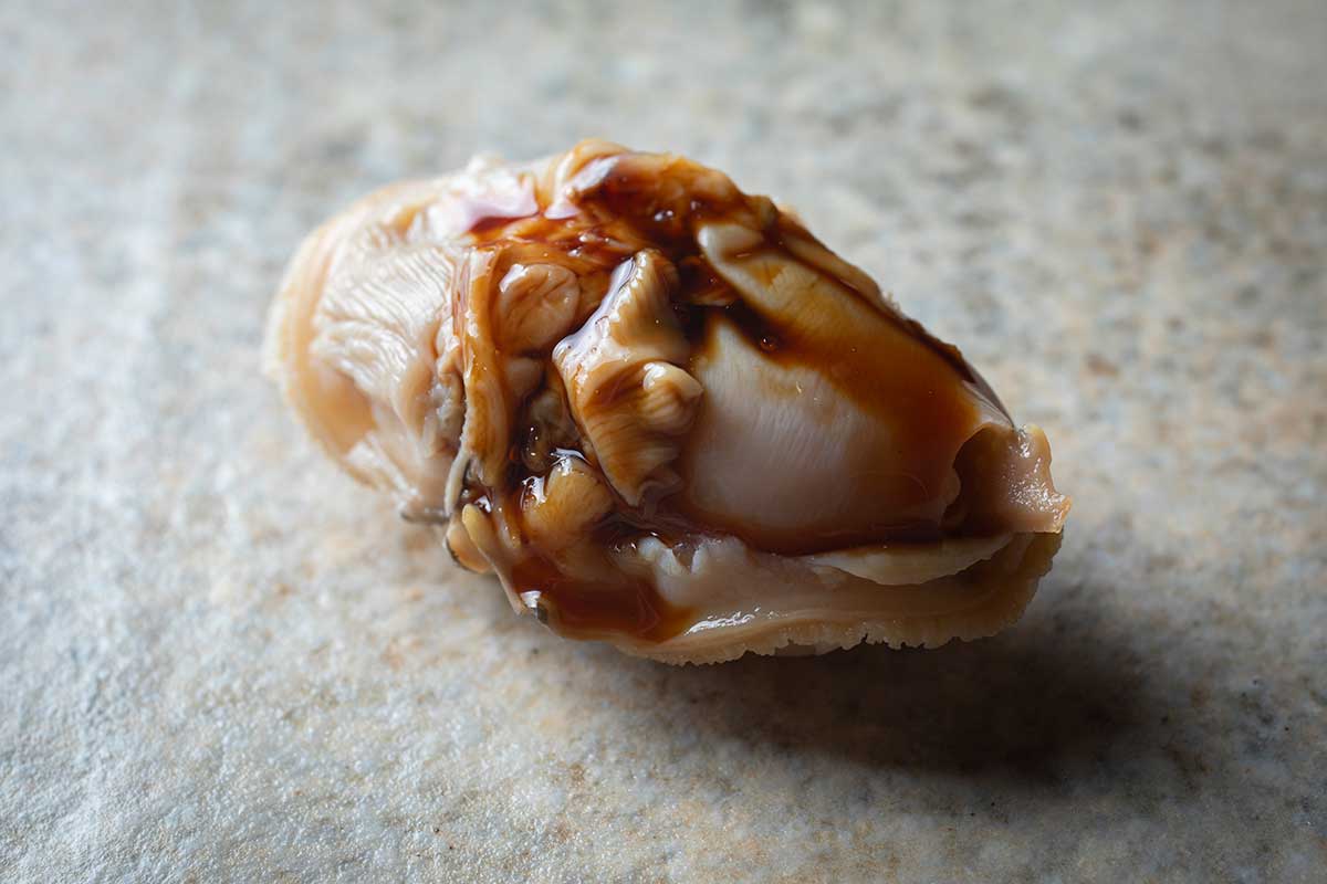 「はまぐり」。茹でて醤油ベースの地に漬け、ツメを塗って。