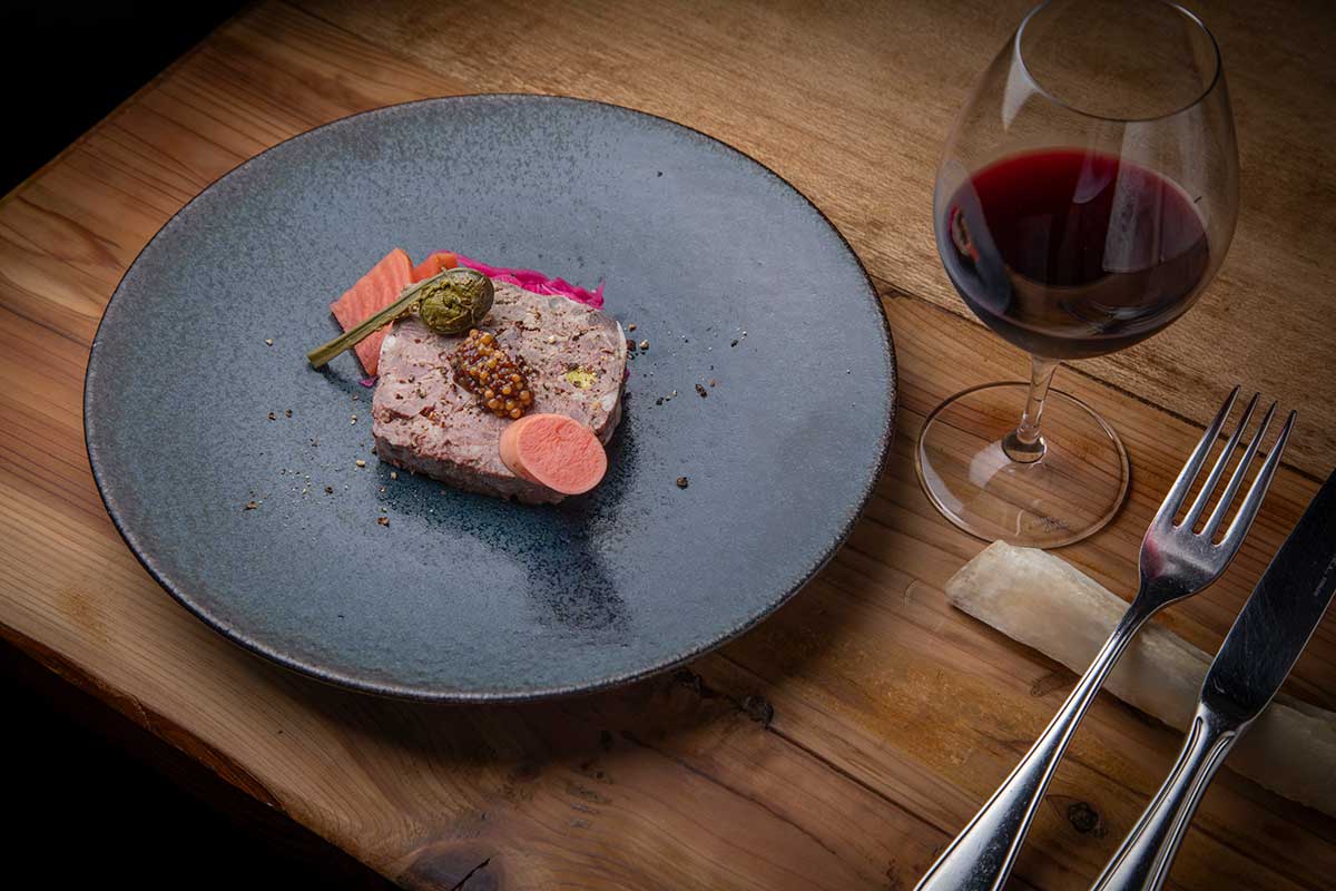 0.8mmと1.6mmの超が付くほど粗く挽いてパテに。味付けは塩と胡椒、スパイスはほんの少しだけという、肉が主役の味わいだ